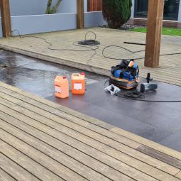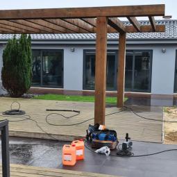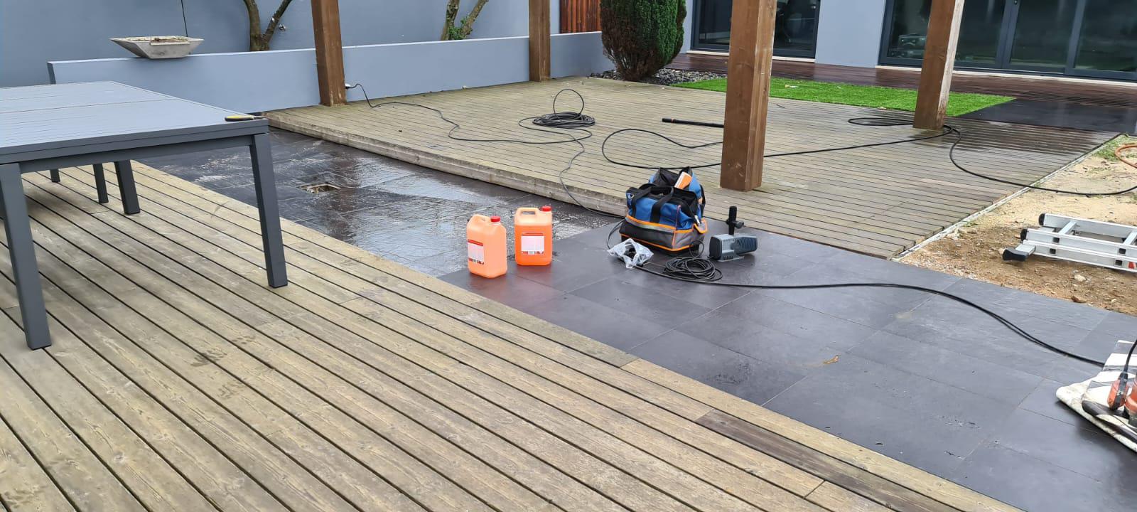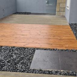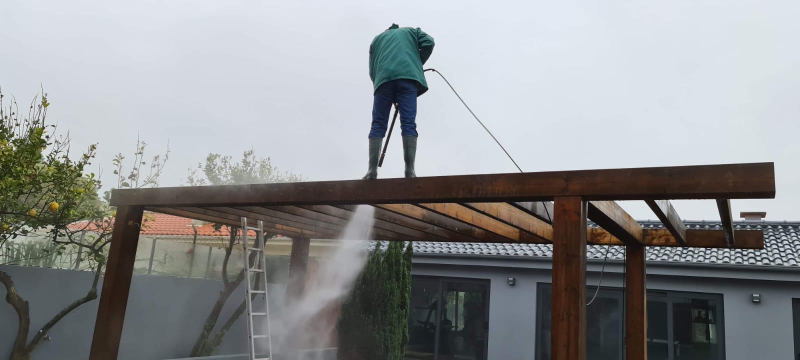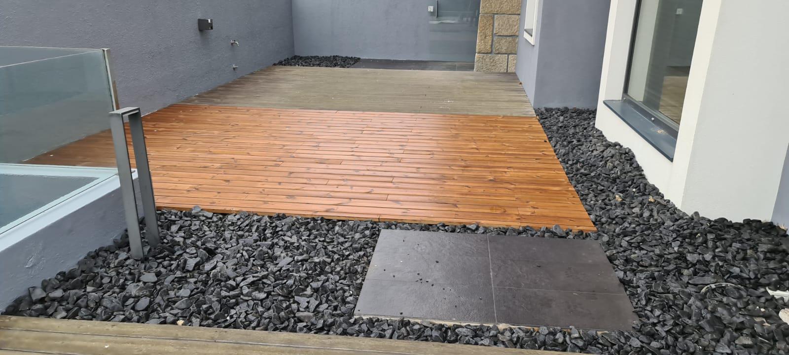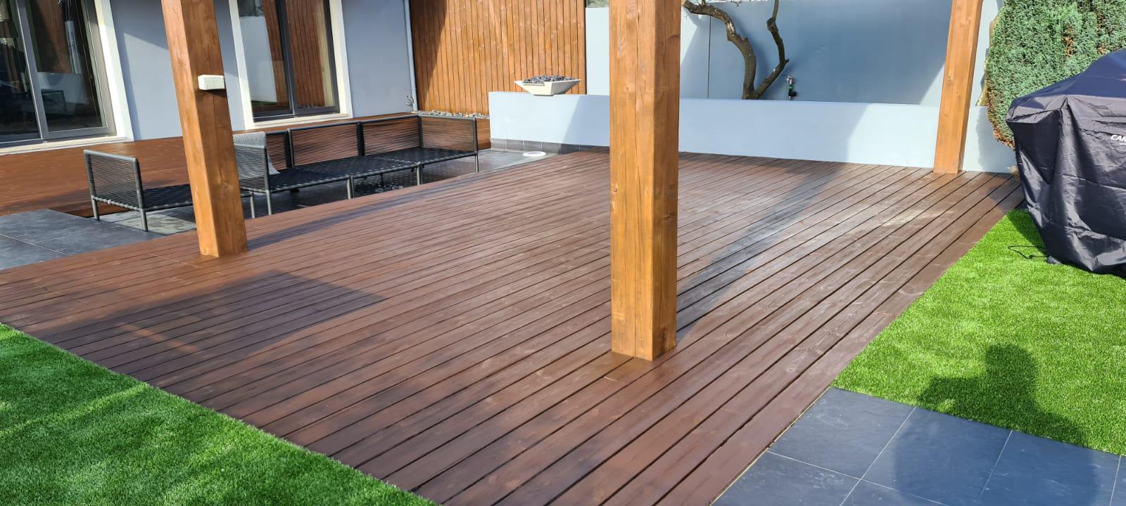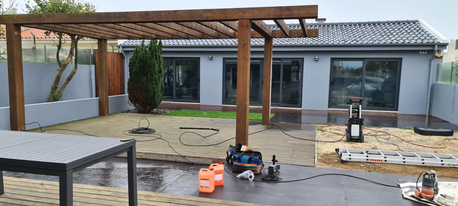 Obra: Reabilitação de área exterior com decks, pérgola em madeira e relva sintética